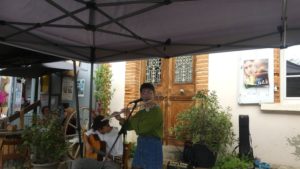 Samedi 4 octobre à 11h30 a débuté le concert de Lilou à la flûte traversière, accompagnée par Antoine à la guitare. Un duo qui a enchanté le public venu nombreux pour les écouter. Lilou est originaire de Samatan, elle est passée par l’école musicale à Toulouse, puis à Paris. Elle a ensuite intégré le club de jazz à Toulouse, puis le labo jazz de Toulouse. Elle joue en duo aujourd’hui, mais c’est une meneuse de groupe donc elle peut jouer avec plusieurs musiciens et de plusieurs instruments. Son répertoire va de Boris Vian à Barbara en passant par Rita Pailles, c’est-à-dire varié. C’est une musicienne, chanteuse, compositrice… Elle a été remarquée au festival off de Saint-Gaudens.